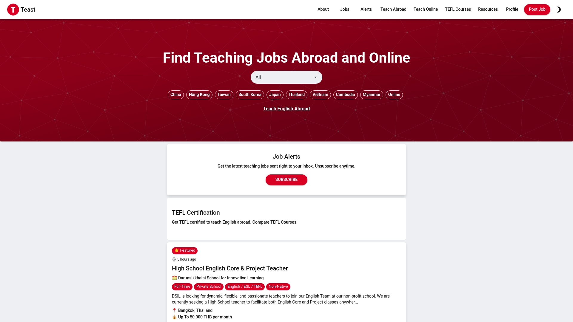 Teast offers job listings for teaching positions abroad and online, TEFL certification courses, and job alerts to keep users informed. The platform also provides profile management for applications and a resource hub aimed at teachers pursuing international opportunities.
