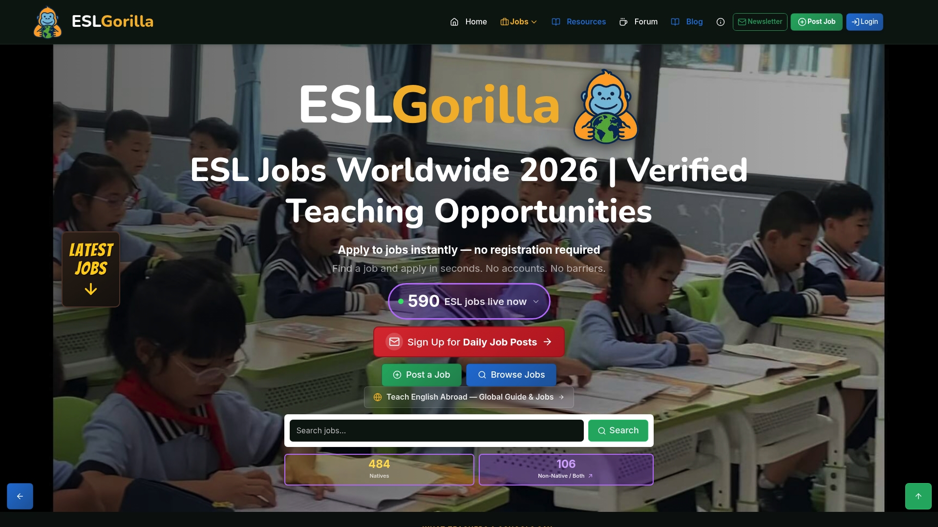 ESLGorilla is a simple, focused job board that connects teachers with verified ESL job listings worldwide. The platform favours speed and accessibility by offering no registration required for applicants, so you can find and apply quickly without barriers.