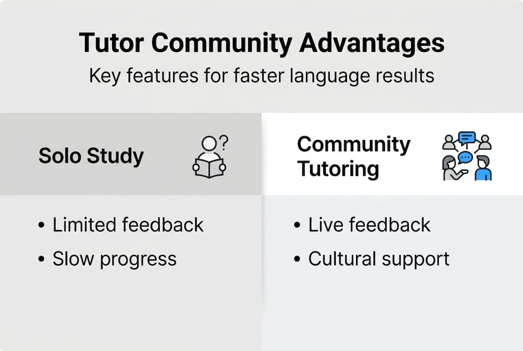 You receive live feedback, cultural context, and real conversation opportunities that static app lessons cannot provide. Community-based tutoring adds real interaction and context that makes language skills stick in the real world.